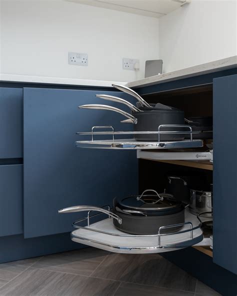 If you can't fit your pots and pans into your square cabinet, consider installing a corner pullout cabinet system. It'll easily open and close, while making those pots accessible.